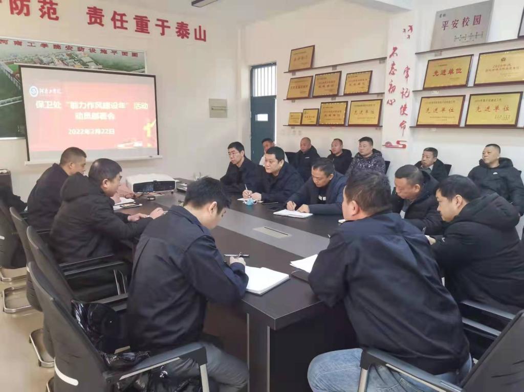 随后,按照学校党委《河南工学院“能力作风建设年”活动实施方案》文件要求,保卫处召开了“能力作风建设年”活动动员大会。秦永波副处长传达了《河南工学院“能力作风建设年”活动实施方案》文件精神,并宣读了《保卫处“能力作风建设年”活动实施方案》,并对重点工作任务的具体内容、工作举措、时间进度、责任人作出了详细安排。