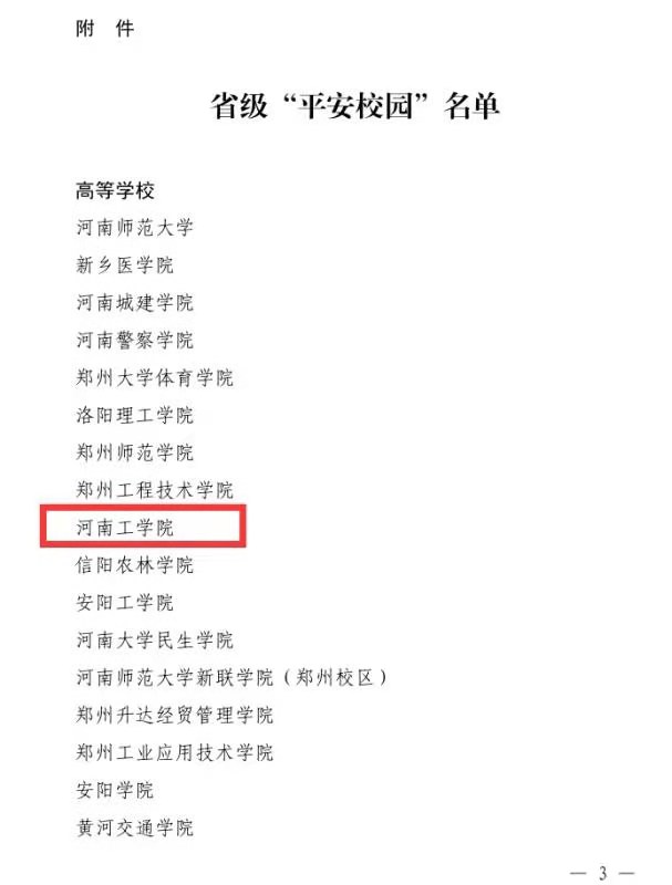 近日,河南省教育厅、河南省平安建设工作领导小组办公室、河南省公安厅3部门联合下发了《关于命名省级“平安校园”的通报》(教安全〔2020〕527 号),我校被命名为省级“平安校园”,这也是我校连续第二次获此殊荣!