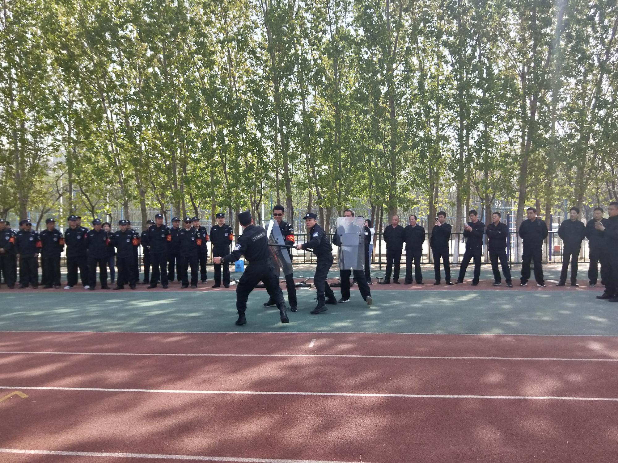 为使我校学生了解当前国内外反恐形势,认清恐怖主义的本质和危害,为进一步提高我校安保队伍的业务水平和实战技能,保持和谐稳定的校园环境,4月9日上午,我校开展了反恐防暴演练活动。保卫处全体人员、保安公司全体人员以及学生代表参加了活动,新乡市公安局特警支队作训大队副大队长吴子汉、教官周龙飞对活动进行指导。
