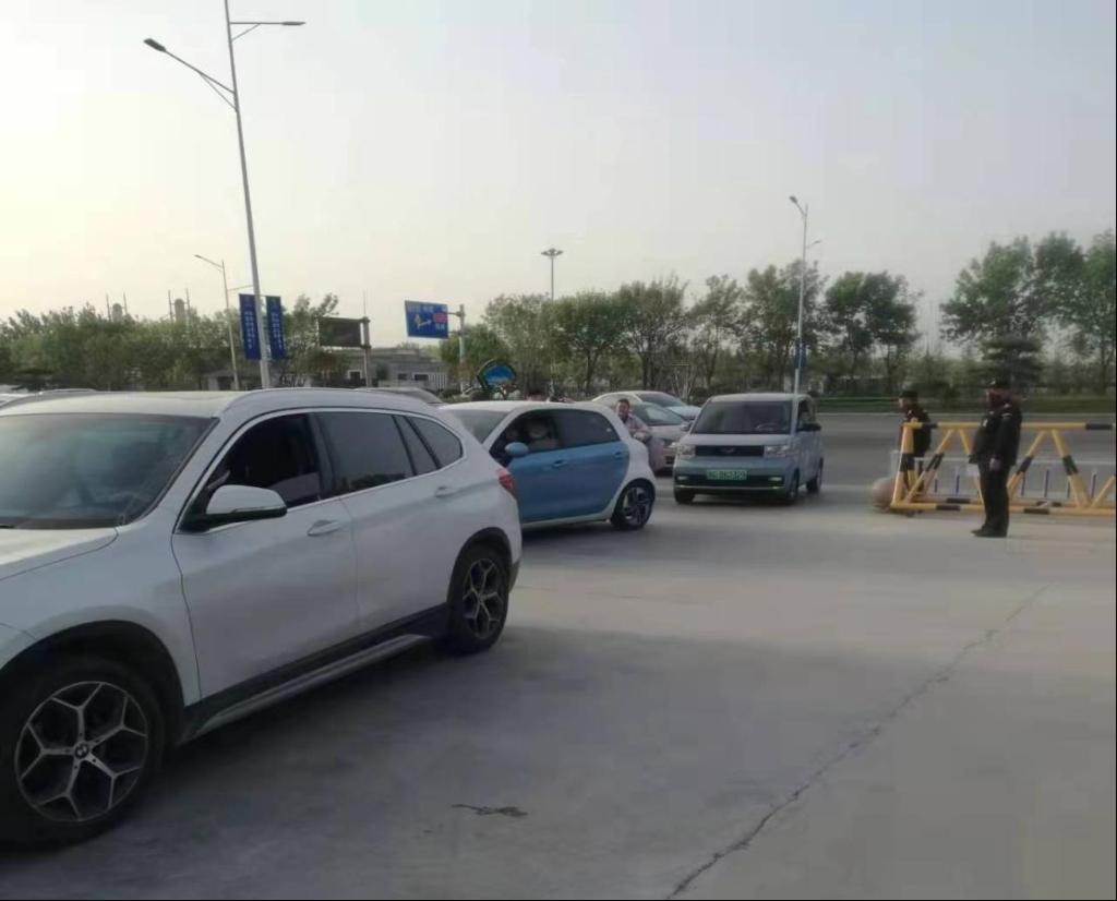 工作人员指挥车辆进入校园