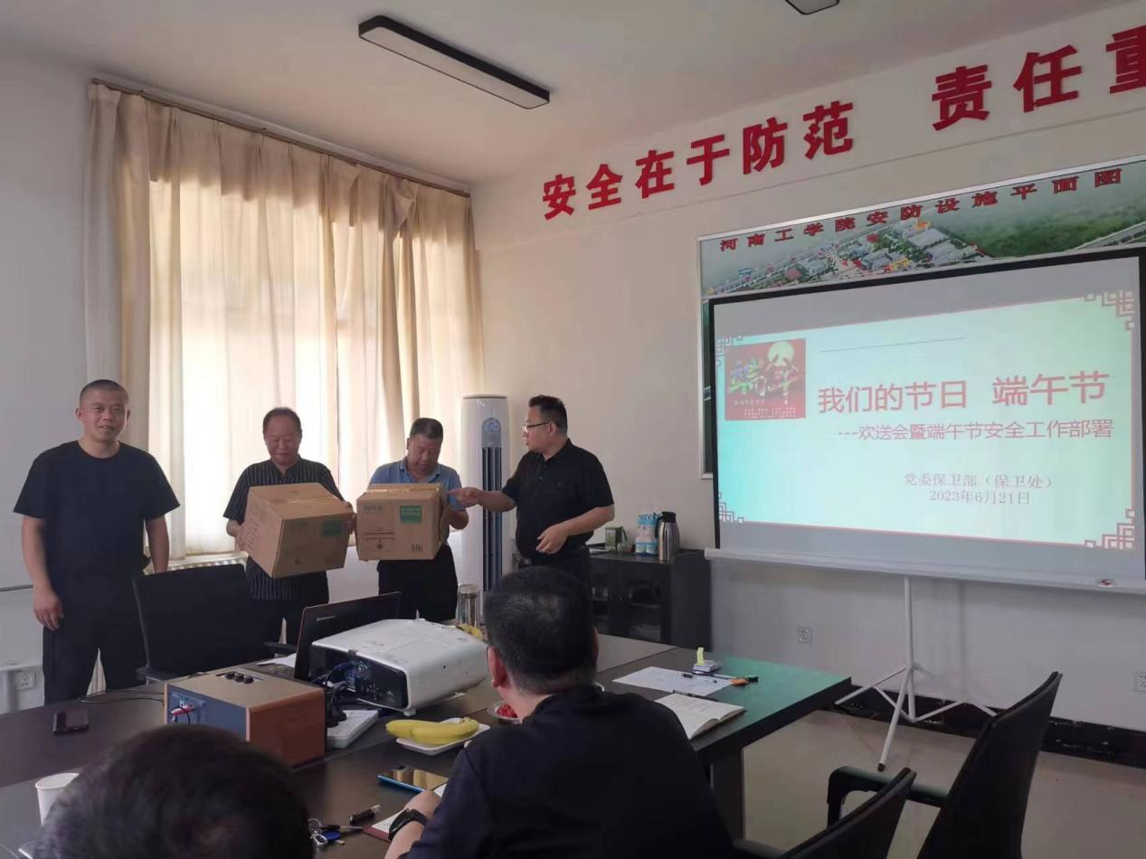 6月21日上午,河南工学院党委保卫部(保卫处)举行2023年度退休员工欢送仪式暨端午节前后工作会议,全体人员参与,会议由党委保卫部副部长、保卫处副处长郭锐主持。