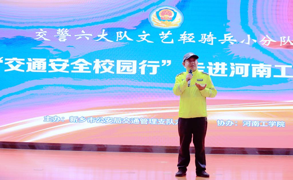 新乡市公安局交通管理支队副支队长李震在现场讲话。他代表交警部门向一直以来理解支持公安交管工作的学校领导和师生表示衷心感谢。他表示,此次巡演不仅是一场形式新颖的文艺演出,更是一堂意义深刻的生命安全课。新乡交警将持续创新宣传形式,深入高校,贴近学生,为同学们的平安出行保驾护航。
