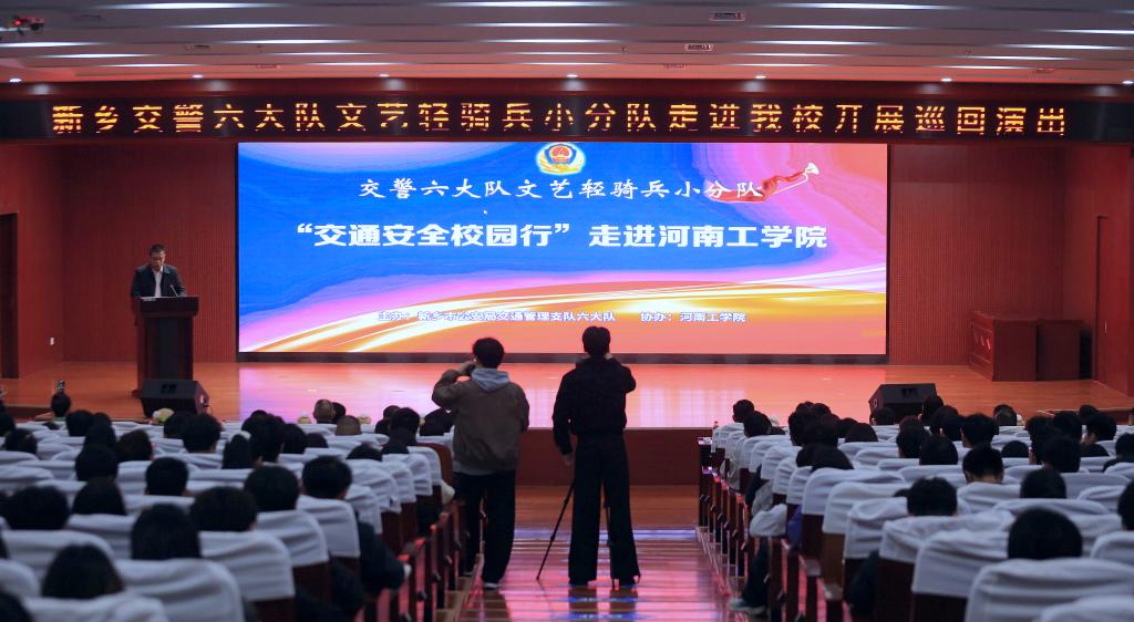 为进一步增强广大师生的交通安全意识,营造安全、文明、和谐的校园交通环境,10月28日晚,新乡市公安局交通管理支队六大队“文艺轻骑兵”小分队走进河南工学院,在创新楼2楼报告厅成功举办了“交通安全校园行”主题巡演。保卫处处长秦永波、新乡市公安局交通管理支队副支队长李震出席活动,统战部、学生处、校团委等部门负责人及五百余名师生共同观看演出。