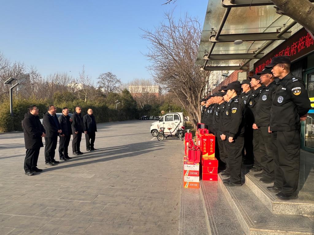 春节将至,情暖人心。2月11日上午,新乡市红旗区副区长张义旺、红旗区交通运输局局长申毅、副局长赵元勋、副局长刘镇一行专程莅临我校,亲切看望并慰问了春节期间仍将坚守岗位的学校保卫处全体保安人员。我校副校长文永林、党委保卫部部长、保卫处处长秦永波;党委保卫部副部长、保卫处副处长郭锐陪同慰问。
