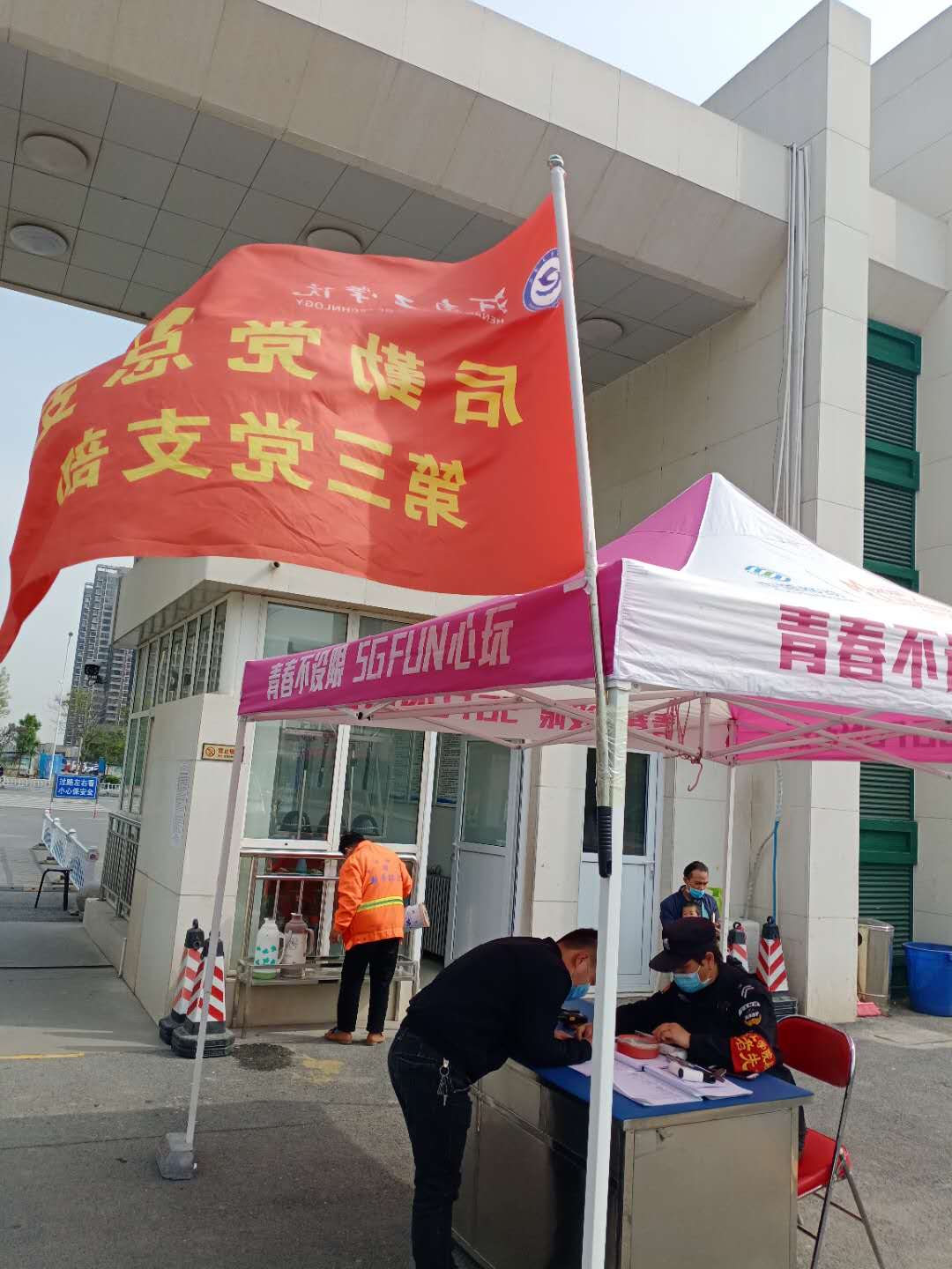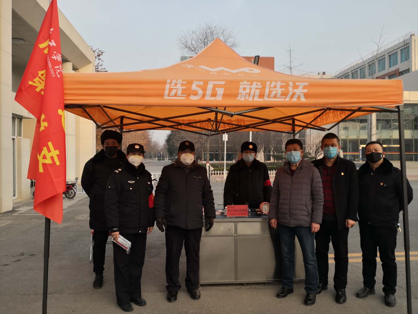 在学校各个防控关键岗上,保卫处领导班子亲临一线指挥工作,带头轮流值守,主动靠前,不畏严寒,坚守岗位,充分发挥先锋模范带头作用,勇于担当,切实增强“四个意识”,坚定“四个自信”,做到“两个维护”,全力投入疫情防控一线工作中。同时,积极响应后勤党总支的号召把党支部旗帜插在大门执勤岗位上,成立了党员模范先锋岗,积极主动参与中原路无主庭院、2号家属院的疫情防控值守工作。此外,还带领党员、群众捐款支持疫情防控工作。