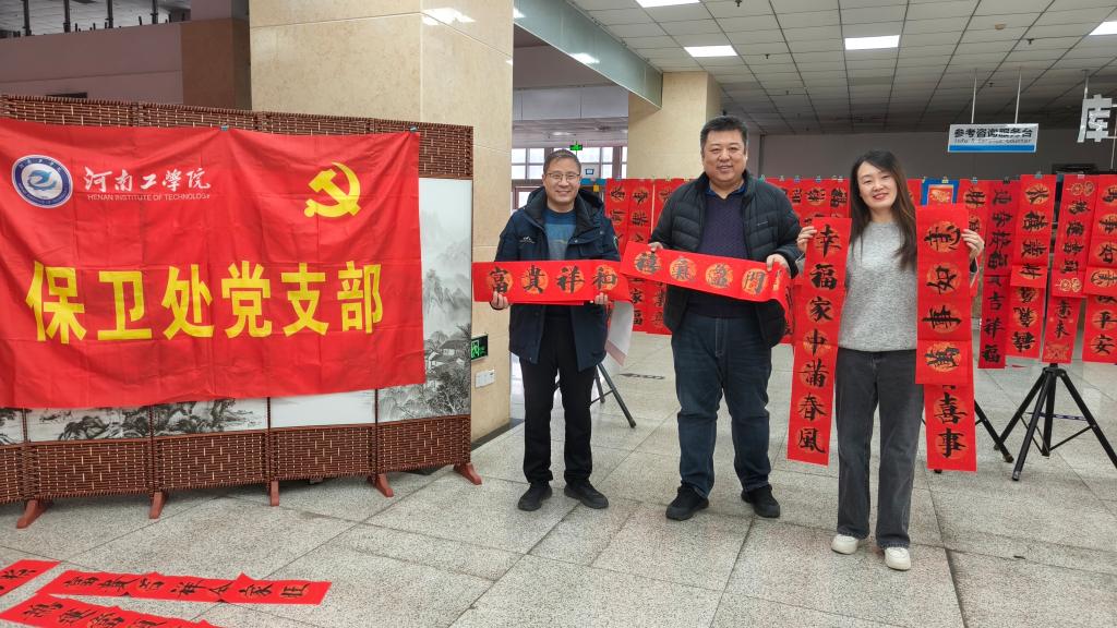 为弘扬中华优秀传统文化,营造欢乐祥和的节日氛围,近日,我处在图书馆一楼大厅开展“迎新年·写春联”活动。此次活动由党委保卫部承办,以“迎春送福写对联 平安守护贺新年”为主题,将党建工作与传统年俗相融合,以笔墨传递祝福,用温情凝聚力量,为寒冬里仍坚守岗位、默默奉献的教职员工送上最真挚的新春问候,让校园处处洋溢着浓浓的年味与暖意。