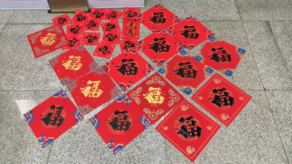 活动现场暖意融融,墨香袅袅。党委保卫部特邀队员孙光胜化身书法行家,挥毫泼墨,笔走龙蛇,一张张大红春联在他的笔下徐徐展开,墨香浸润着整个活动现场。“幸福家中满春风,和顺门里皆喜事”“金玉满堂门兴旺,福星高照家平安”……一副副寓意平安吉祥的春联呈现于纸上,一笔一划间饱含深情;一张张笔力刚劲、喜气盈然的“福”字,寄托着对新一年校园平安和谐的美好期许,也饱含着对教职员工安康顺遂的诚挚祝愿。
